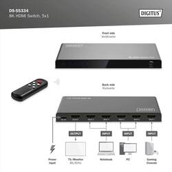 Digitus® 8K HDMI switch, 5x1 umožňuje připojení dalších HDMI konektorů k výstupnímu displeji - 5 zdrojů signálu přes 1 HDMI připojení na monitor. Video přepínač je napájen přes kabel USB-C, např. přes zdrojovou jednotku nebo USB nabíjecí adaptér. Můžete pohodlně přepínat mezi zdroji signálu pomocí dálkového ovládání, přímo na zařízení nebo pomocí automatického rozpoznání. Ideální pro montáž televizoru na stěnu - stačí pouze jeden HDMI kabel pro připojení zdrojů.