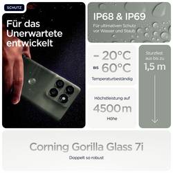 | Vlastnosti mobilního telefonu | Corning® Gorilla® Glass 7i · pOLED · MIL-STD-810H · IP68 · s NFC · HDR · Obnovovací frekvence 120 Hz · funkce nabíjení QI |