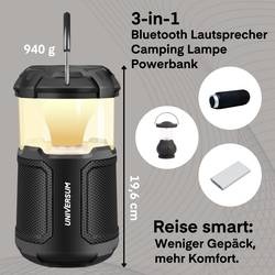 Užijte si dokonalou venkovní zábavu s kempinkovou svítilnou Universum BT 300 s reproduktorem a powerbankou. Tento multifunkční reproduktor spojuje výkonný systém Bluetooth reproduktorů s jasným LED osvětlením a praktickou funkcí powerbanky. S výstupním výkonem 20 W nabízí reproduktor čistý a silný zvuk, zatímco LED osvětlení s 2300 lux navodí atmosféru. K přehrávání hudby lze nastavit RGB režim změny barev, který v rytmu pro naladění hudby. LED zahradní svítilna je stmívatelná a může sloužit jako světlová lucerna pro osvětlení cesty nebo k vytvoření příjemné atmosféry.