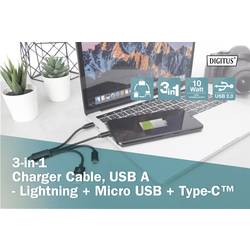 Nabíjecí kabel Digitus 3-in-1 je ideal pro nabíjení přenosných zařízení s USB-C™, Apple Lightning nebo Micro-B připojením na síťový zdroj, PC nebo jiné zařízení s USB A. Využijte kabel pro nabíjení všech svých zařízení. Díky kompaktním rozměrům je kabel ideálním společníkem do domácnosti, kanceláře nebo na cesty.