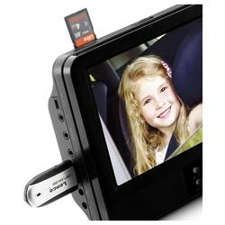 Přes USB vstup nebo slot na SD/MMC karty můžete také přehrávat vlastní videa a fotografie na DVD přehrávači a společně s rodinou sledovat. DVD přehrávač se díky dodanému pevnému držáku pohodlně upevní na zadní stranu opěrky hlavy. Stojan umožňuje také uvolněné sledování na rovném povrchu.