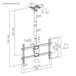 Stropní TV držák lze otáčet o 360°. To umožňuje pohled z každé pozice v místnosti. Tento stropní držák se skvěle hodí pro velké a těžké televizory, a to jak ve svém obývacím pokoji, tak v obchodech či veřejných prostorách. Díky teleskopické tyči lze nastavit montážní výšku pro danou výšku místnosti. Obrazovku lze díky funkci naklápění a otáčení perfektně nastavit. Stropní držák je vhodný pro ploché i šikmé stropy. Díky variabilnímu vzdálenosti stropu až 92,5 cm je držák ideální i pro vysoké stropy ve starých budovách. Ať už doma v domácím kině, v kuchyni nebo jako infopanel ve veřejných prostorách - s stropním držákem pro TV splní všechna vaše přání. Perfektní řešení pro soukromé nebo profesionální použití; otočný o 360°, sklopný, variabilní vzdálenost od stropu, i pro šikmé stropy. Technické detaily: Pro obrazovky 43" - 86" (109 - 218 cm) zatížení: Do 60 kg stran otočná: 360 ° sklon: 0° ~ - 25° horizontálně adaptabilní: +/- 3° vzdálenost stropu: 485 - 925 mm VESA 200 x 200, 300 x 200, 400 x 300, 400 x 400 x 400, 600 x 400 x 400, 400 x 400 x 400, vč. Návod k montáži a montážní materiál v prodejní karton. Návod ke stažení
