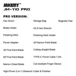 JAKEMY JM-Y10 PRO je výkonný přístroj 2v1, který využívá přesnou technologii ultrazvukových vibrací k účinnému provádění řezacích, brusných a lešticích prací. 35W ultrazvukový systém s frekvencí 40 kHz a Dual Core PZT keramickou technologií umožňuje čisté a rychlé výsledky.