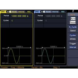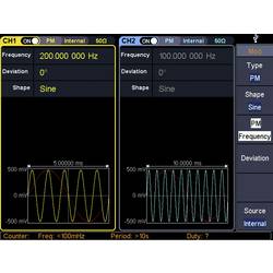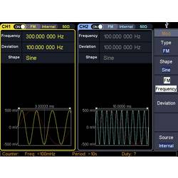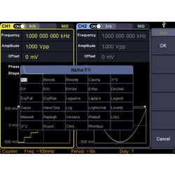 - 6 základních průběhů signálu: Sinus, obdélník, impuls, rampa, šum a harmonické vlny, 152 vestavěných arbitrárních signálních funkcí Mnoho možností modulace: AM, FM, PM, FSK, 3FSK, PSK, OSK, ASK, BPSK, PWM, Sweep, Burst