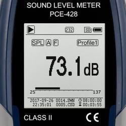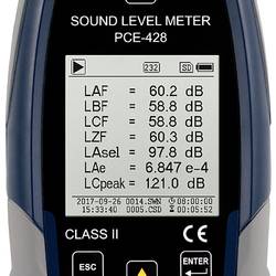 Měřič hladiny zvuku s kalibrátorem hladiny zvuku třídy II s oktávovým filtrem nebo 1/3 oktávovým filtrem pro frekvenční analýzu / USB rozhraní / datalogger / a, B, C, z vyhodnocení / Fast, Slow a impulsní analýzu Hlukoměr PCE-428 je optimální měřič hladiny hluku pro měření na pracovištích, na stavbách, v silničním provozu, na letištích atd. měřič hladiny zvuku je zařízení třídy 2 a je vybaven oktávovým frekvenčním filtrem. Volitelně lze Hlukoměr PCE-428 rozšířit o 1/3 oktávový pásmový filtr. Vedle číselné hodnoty lze zobrazit graf, který zobrazuje průběh hladiny zvuku. Hlukoměr má různá vyhodnocení frekvence jako a, B, C a Např. dále. Přístroj dokáže měřit s časovými vyhodnoceními rychle, pomalu, impulzně a peak. Rozsah měření hlukoměru je 25... 136 dBA při frekvenci 20 Hz... 12,5 kHz. Hlukoměr lze nastavit 3 různých měřicích profilů. Zde může uživatel zvolit, které parametry měřič hladiny hluku zaznamená. Lze zvolit například mezi Laeq, LcPeak, LaFmax, LaFmin atd. Funkce Pedakhold v zařízení na měření hladiny zvuku umožňuje dlouhodobé měření zachycovat maximální hladinu akustického tlaku a namrznout na displeji. 24 bitový a/D převodník a speciálně vyvinutá elektronika měřiče hladiny hluku přispívají k redukci šumu na velmi nízkou úroveň. Snímání měřeného signálu s frekvencí více než 48 kHz umožňuje vysokou přesnost a lepší stabilitu měřené hodnoty na zvukoměru.