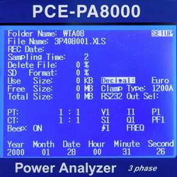 Měřicí přístroj HVAC PCE-PA 8000 s pamětí na SD kartu, PC rozhraním s ampérmetrem PCE-PA 8000 je možné měřit a zaznamenávat výkon v jednom a třífázovém obvodu. Pomocí ampérmetru PCE-PA 8000 lze provádět dlouhodobá měření. Naměřené údaje uloží měřicí přístroj na zásuvnou SD kartu ve formátu XLS. Díky tomu můžete naměřená data pohodlně vyhodnocovat na počítači. Interval záznamu je volně volitelný od 2 do 7200 sekund. Měřič spotřeby energie musí být schopen provádět měření energie a určit účiník a fázový úhel. Proudové kleště analyzátoru výkonu PCE-PA 8000 lze použít pro průměr vodiče až 50 mm. Díky tomu se tento měřicí přístroj výborně hodí pro použití v energetické síti. Díky velkému displeji 3,7“ lze na jeden pohled číst všechny naměřené hodnoty. Tak je možná rychlá analýza aktuálních naměřených hodnot a zajišťuje přehled o proudu, napětí a odebíraném výkonu.