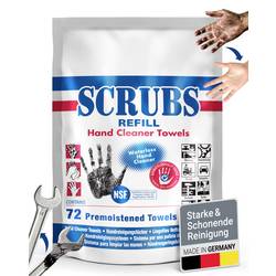 Čisticí utěrky SCRUBS® jsou velmi účinné čisticí utěrky na ruce, nástroje a součásti strojů. Scrubs® snadno odstraňuje těžké MASTNOTU, mazivo, lepidla, oleje, tér, bitumen, inkoust, barva, zvuk, uhlíkový bahna, grafit, travní skvrny, vosk a mnoho dalšího, bez použití vody. Hadříky, které lze rychle rozpoznat svou modrou barvou, jsou připraveny k použití a zvlhčeny jedinečným čisticím složením. Základem je dvojí struktura, která dokáže odstranit nejrůznější nečistoty, absorbuje a vstřebává nečistoty. Abrazivní strana je ideální pro odstranění maziv nebo podobné silné povrchové pily, aniž by se na ní poškrábala. Díky tomu je Scrubs® čistící hadřík, který umožňuje rychlé čištění povrchů po údržbě nebo montážních pracích– nebo použití s nástroji s mazivy pro další použití. Druhá strana látky je díky svému měkkému povrchu použitelná pro čištění rukou šetrné k pokožce. Ekologický způsob, jak zbavit se nečistot všeho druhu, jsou naše čisticí utěrky SCRUBS - nyní také v balení pro náhradní filtry.