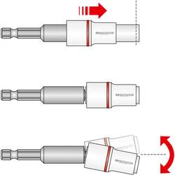 Držák bitů „Flex“ Profesionální řešení problémů pro úzké oblasti a rohy. Otočný o 20°. Držák bitů s kulovou hlavou s rychloupínacím posuvným pouzdrem a silným neodymovým magnetem. Použitelný také jako standardní magnetický držák. Pro všechny bity podle DIN 3126 / ISO 1173 tvar C 6,3.