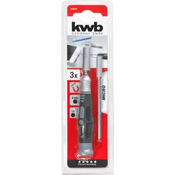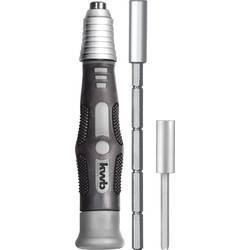 Ruční šroubovák kwb s uchycením z hliníku pro micro bity s 4mm dříkem a pro standardní bity s dříkem C 6.3. Díky dvěma magnetickým prodloužením lze pohodlně dosáhnout na hluboko ležící šrouby. Prodloužení lze v ručním šroubováku v různých polohách jednoduše zaaretovat pomocí blokovacích zářezů. Aretaci lze snadno uvolnit díky posunutí hliníkového uchycení.
