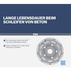 Vynikající životnost u betonu - diamantový hrncový kotouč Expert for Concrete s vysokou životností dosahuje při broušení betonových vrstev vynikající životnosti. Dvouřadé uspořádání 18 segmentů zajišťuje vynikající odolnost a rovnoměrné broušení povrchu pro menší zkroucení. Vysoká rovnováha brusné hlavy zajišťuje broušení řízené vibracemi. Je kompatibilní s úhlovou bruskou. Vysoká rovnováha umožňuje práci řízenou vibracemi, což chrání uživatele i elektrické nářadí. S průměrem otvoru 22,23 mm pro brusku na beton a úhlovou brusku s upínací maticí.