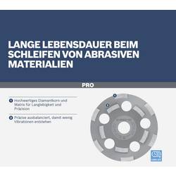 Hodí se pro velkoplošný úběr abrazivních materiálů, jako je vápenná omítka, potěr (podklad podlahy), pískovec nebo velmi abrazivní beton – nehodí se pro broušení tvrdých materiálů. Pájené segmenty. Dvě řady segmentů pro rovné obroušení. Maximální nevyváženost 50 g*mm pro práci bez vibrací. 125 x 22,23 x 4,5 mm.