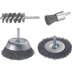 - materiál: Ocelový drát. Obsah: 1 drátěný kartáč pro čelní sklo, ø 75 x 10 mm, 1 drátěný kartáč pro hrnce, ø 75 mm, 1 válcový kartáč, ø 28 x 60 x 90 mm drátěný kartáč pro štětce, ø 25 mm. Kulatý dřík ø 6 mm.
