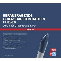 Vydrží až 10-krát déle než standardní vrtáky do obkladů - protože obklady na obklady jsou nyní stále větší a tvrdší, je také obtížnější vrtání děr s vrtákem pro dlaždice. Proto Bosch vyvinula HardCeramic S jeho pomocí lze nasucho vrtat tvrdou keramiku. Kromě toho vydrží mnohem déle než náš srovnávací vrták pro dlaždice. Pro tento speciální vrták z tvrdé keramiky se používá technologie Bosch’s Carbide (technologie Carbide od společnosti Bosch). Karbidy jsou nejtvrdší kovy. Je kombinována s pokročilou, víceřeznou špičkou, která rozděluje pracovní zatížení na více asymetrických ploch. Tento komplexní hrot vrtáku, vyrobený jemně broušenou výrobní metodou, umožňuje přesné navrtání bez prokluzování a poškrábání. Vrták Bosch Expert HEX-9 HardCeramic je vhodný pro vrtání keramiky. Bez maziva nebo chlazení může do tvrdých dlaždic vrtat otvory. Šestihranná stopka pro maximální přenos síly ve standardních vrtacích drážkách a v šestihranných upínací stopkách.