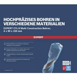 Až 5-krát přesnější než standardní vrtáky - moderny vyžadují práci s mnoha různými materiály a člověk nikdy neví, was co je třeba vrtat dále. Vyhledání správného vrtáku může být obtížné a časově náročné - s výjimkou případů, kdy je vrták Expert MultiConstruction. Tento extrémně univerzální vrták umožňuje přesné vrtání do tvrdých materiálů, jako jsou např. dlaždice nebo granit, aniž by vyklouzl. To je umožněno díky ostrému hrotu a pokročilému geometrickému designu. Je vyroben z optimalizované karbidové výroby s jemným výbrusem a je tak vhodný pro beton, cihly, dřevo a kov. Nezávislý na materiálu zajišťuje vždy profesionální práci. Kulatý vrták Bosch Expert CYL-9 Multicobstruction nesmí chybět v žádné sadě nářadí: Můžete přesně vyřídit každou práci a neztrácí se čas hledáním správného vrtáku....“; provedení Bosch Expert CYL-14 je univerzální. Cylindrický dřík je vhodný pro sklíčidlo s ozubeným věncem.