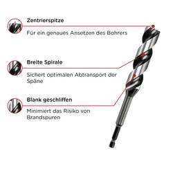 Japan hadovitý vrták, průmyslová kvalita, speciální velmi ostrý výbrus s horním výbrusem a hlavní břity pro vrtání bez vytrhávání ve všech dřev s měkkým a tvrdým olejem. Díky tomuto speciálnímu výbrusu jsou vyráběny pouze malé dřevěné třísky, které se rychle přenášíjí. Barva černá, broušené, CV ocel, se šestihrannou stopkou 1/4“ podle ISO 1173, E 6.3, pro přesné a účinné vrtání s aku-strojními a kabelovými stroji. Optimální pro všechny vrtání do dřevěných trámů a všech druhů dřeva. Obzvláště vhodné pro otvory v průhledném prostoru pro stolní stolce, interiérové montáže, cílový laser.