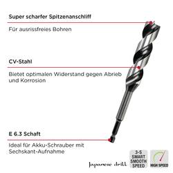 Japan hadovitý vrták, průmyslová kvalita, speciální velmi ostrý výbrus s horním výbrusem a hlavní břity pro vrtání bez vytrhávání ve všech dřev s měkkým a tvrdým olejem. Díky tomuto speciálnímu výbrusu jsou vyráběny pouze malé dřevěné třísky, které se rychle přenášíjí. Barva černá, broušené, CV ocel, se šestihrannou stopkou 1/4“ podle ISO 1173, E 6.3, pro přesné a účinné vrtání s aku-strojními a kabelovými stroji. Optimální pro všechny vrtání do dřevěných trámů a všech druhů dřeva. Obzvláště vhodné pro otvory v průhledném prostoru pro stolní stolce, interiérové montáže, cílový laser.