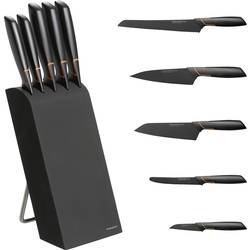 Blok může Block být namontován na zeď nebo uložen na zásuvce. Obsahuje škrabací nůž, nůž na rajčata s pilkovým ostřím, nůž na chléb s pilkovým ostřím, velký nůž na vaření a nůž Santoku. Nože lze mýt v myčce. Navrženo ve Finsku.