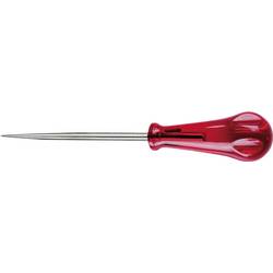 - Hrot z chrom-vanadové oceli, spojitě zakalené a leskle poniklované. Kulatá rukojeť z acetátu celulózy, odolná proti úderu, červená transparentní, bez kadmia.