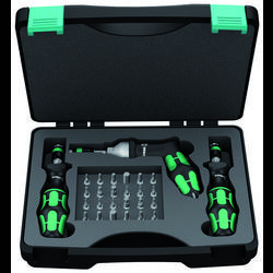 - 1x nastavitelný momentový šroubovák Kraftform s 6,3 mm (1/4") rychloupínacím sklíčidlem Rapidaptor 7440 (upínací síla 0,3 - 1,2 Nm v krocích po 0,05 Nm) a 7441 (upínací síla 1,2 - 3,0 Nm v krocích po 0,10 Nm)