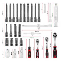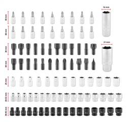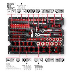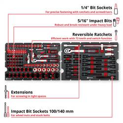 - 1x sada nástrčných hlavic (1/4", 3/8", 1/2" CRV/CrMo 8 - 32 mm), 3x přepínací ráčny (1/4", 3/8", 1/2", 72 zubů), 15x bit Impact (5/16" S2), 6x nástrčný klíč (1/4"), 2x nástavec na zapalovací svíčky (16 / 21 mm), 4x nástrčné hlavice (50 / 100 / 125 / 250 mm), 2x kardanový kloub (1/4" / 1/2"), 1x adaptér na bity (1/2" / 5 4/16 150" šestihran), 1x rukojeť T / 1/4"; 1x nopková pěna, 1x systémový kufr E-Case lze stohovat do 300 kg