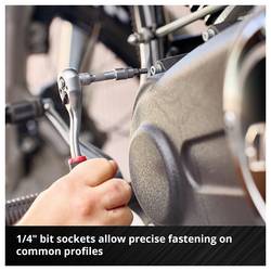121-dílný kufr na nářadí v autech systému e-Case od společnosti Einhell je ideal pro údržbu a opravy vozidel, strojů a motorů. Nástrčné klíče Impact a speciální bity jsou určeny pro přesnou práci na komponentech motoru, převodovky a podvozku. Nástrčné klíče 1/4" z chrom-vanadiové oceli jsou vhodné pro práci na elektronice, vnitřním prostoru a krytu, zatímco nástrčné klíče 3/8" jsou určeny pro díly motoru a menší řemeslné práce. Nástrčné hlavice 1/2" z chrom-molybdenové oceli, 8 - 32 mm, jsou optimální pro montáž kol a podvozku. Nástrčné bitové hlavice Impact v délce 55, 100 a 140 mm z oceli S2 umožňují uvolnění pevně utažených šroubů a jsou odolné proti nárazu, vhodné pro rázový utahovák. Sada je doplněna 1/4" šroubovákem, prodlužováním (50/100/125/250 mm), kardanovými klouby a T rukojetí s kluzným prvkem. Tři přepínací ráčny (1/4", 3/8", 1/2") se 72 zuby, pravý/levý chod a stisknutí tlačítka zajistí vysoké krouticí momenty. Dvě nástavce na zapalovací svíčky (16/21 mm) umožňují bezpečnou výměnu běžných svíček. Všechny nástroje jsou uloženy v pěně z EVA s nopkovou pěnou, která je ve stohovatelném systémovém kufru E-Case. Nosnost až 300 kg a nosnost až 1.000 kg.