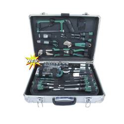 Hliníkový kufr na náradí, obsah: 6 x šroubovák, CV-ocel, 2 x šroubovák pro jemné mechaniky, CV-ocel, 1 x zkoušecka napetí, 1 x šroubovací rukojet, 1 x rácna 10 mm (3/8 "), 2x prodloužení CV ocel, 1 x nástavec na svícky, 9 x šestihranný nástavec, CV-ocel, s bocní prevodem 10 mm (3/8 "), 8 x šestihranný nástavec, CV ocel, s bocní prevodem 6,3 mm (1/4 ") 1 x adaptér na nástrckové klíce, 1 x adaptér bitu 61dílný, sortiment bitu vcetne rychle vymenitelného držáku bitu, 1 x SIKA klešte 250 mm (10 ") 1 x kombinované klešte 180 mm (7 ") 1 x svírací klešte s kabelovým ockem, 1 x prestavitelný klíc 1 x odlomitelný nuž, 18mm s 10 náhradními cepelemi, 8 x klíc s vnitrním šestihranem s držákem, 1 x rám pily s 6 pilovými listy