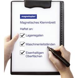 Magnetoplan s magnetickou prkno na svorkovnice. Inovativní + praktická psací deska s magnetickým sklopným zařízením pro fixaci papíru: Stabilní, pevná podložka do kanceláře, skladu a výroby. Omyvatelný díky celoplošnému plastovému potah, vhodné i pro chladničky. Také pro mobilní použití v expedici, v servisu, v údržbě, jeřábech a kurýrech · magnetické upevnění na všech železných površích, jako jsou bílé tabule, stroje, kovové skříně, mřížové boxy, přepážky v kufru atd. integrované magnety drží až 15 listů. Výměna papíru rychlá + snadná: Zvedání magnetického skládacího zařízení - výměna papíru - zavírání - a je hotovo. Černý kryt svorkovnice: S kapsou pro další dokumenty. Rozměry A4: 230 x 320 mm.