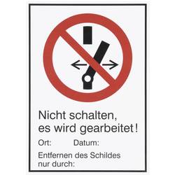 Zákazový štítek k vývěsce: „Nezapněte. Probíhají práce“ podle ASR A1.3 (DIN ISO 7010-P031).
