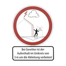 Informační tabule „na bouřce je zákaz pobytu v okruhu 3 m kolem vývodu!“ Při nebezpečí napětí kroku a dotyku pro živé napětí, podle DIN EN 62305-3 (VDE 0185-305-3). Provedení ve dvou jazycích (přední strana v němčině / zadní straně v angličtině).