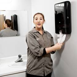 Zásobník na papírové utěrky Tork Cickcak a Lagenz pro nízkofrekvenční čistěte. Hygienicky a úsporně díky vyjmutí utěrek.