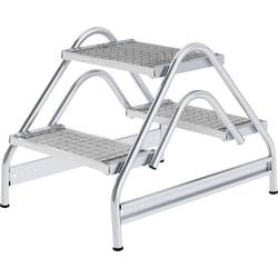 Pracovní plošina z hliníku stabilní svařovaná konstrukce trubky hloubka stupňů a velká nášlapná plocha pro bezpečné postavení protiskluzové plastové patky pro snadnou montáž (dodává se rozložené) volitelné pružinové válečky pro snadný postup z místa na místo. Horní nášlapná plocha: 150 x 300 mm v různých stupních a platinovém provedení pro maximální zatížení: 410 kg