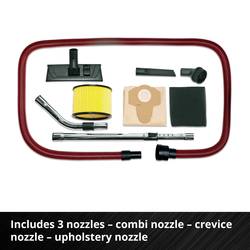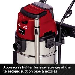 Akumulátorový vysavač pro mokré a suché vysávání Einhell TE-VC 36/30 li s-Solo je nepostradatelný pomocník při vysávání, sušení a úklidu v domě, ve sklepě, v dílně nebo v garáži. Akumulátorový vysavač pro mokré a suché vysávání patří k velmi účinné rodině Power-X-Change, díky čemuž je zásuvka velmi flexibilní a díky výkonným a dlouhouchým akumulátorům je i při obtížných použitích vždy vhodný pomocník do ruky. Jako člen řady PXC lze použít akumulátory celé řady systémů. Díky 2 rychlostem ECO a BOOST je akumulátor optimálně využíván. Nádoba z nerezové oceli pojme 30 litru, je nerezová a stabilní. Připojení Blacerem je určeno pro vyfukování těžko přístupných míst, jako jsou rohy, výklenky a mezerami. Velká kolečka a kolečka umožňují snadný transport. Praktický je zejména držák pro snadné uložení příslušenství, takže během práce stačí držadlo na příslušenství. Pro snadné a rychlé vypouštění připouštěcí vody je na nádrži šroubový uzávěr. Na rukojeti se nachází regulátor chybného vzduchu. Teleskopická trubice o průměru 36 mm je vyrobena z nerezové oceli. Součástí dodávky je vysoce zatížitelná sací hadice (Ø 36 mm, délka 2,5 m), stejně jako velká kombinovaná hubice na koberec a podlahu. Díky přiloženému pěnovému filtru, skládanému filtru a papírovému sáčku na nečistoty nestojí při prvním použití nic v cestě. Akumulátor a nabíječka nejsou součástí dodávky, ty jsou k dispozici samostatně, například jako praktická startovací sada.