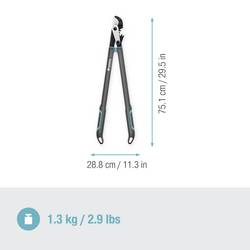 Nůžky na větve GARDENA EnergyCut pro L jsou vybaveny přesně broušenou kvalitní ocelovou čepelí a lehkým převodem pro optimální přenos síly. V rozhodující chvíli, kdy je potřeba maximální síla, zajišťuje snížení únavy díky trojnásobné síle. Uživateli se tak ztrojnásobí řezná síla a díky kombinaci maximální síly s komfortem a přesností se zatížení snižuje.