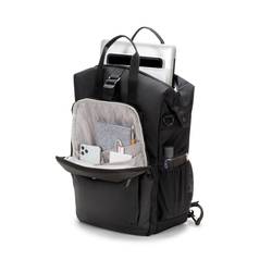 Batoh Eco Dual GO optimálně chrání váš notebook díky polstrované přihrádce na notebook. Nahodistalní přepážka chrání váš notebook Surface a přizpůsobí se svým rozměrům až 15" automaticky. Přihrádka pro tablety nabízí spolehlivou ochranu pro zařízení do 12.9". Pouzdro promění pomocí polstrovaného popruhu na rameno z aktovky v batoh. Prostorná hlavní kapsa je rozdělena tak, aby bylo možné odděleně ukládat dokumenty a příslušenství. Hlavní přihrádku lze rozšířit o další úložný prostor. Kromě toho se nachází kapsa v hlavní přihrádce, ve které může být láhev na pití uložena. Otevřená, rozšiřitelná přihrádka pro sportovní vybavení, jako je obuv, přilba nebo rogamatová podložka, s elastickými bočními kapsami a kovovými háky k upevnění. Přední kapsa s praktickými přihrádkami umožňuje pořádek ve vašem mobilním příslušenství, jako jsou smartphony, pera nebo nabíječky. Skrytá kapsa na zip pro cestovní pas, poštovní tašku atd. Pouzdro je vyrobeno z voděodolného materiálu, aby obsah byl chráněn i během deštných dní. Díky tomu je batoh Eco Dual GO perfektní volbou pro všechny, kteří jsou často na cestách a chtějí díky ekologicky šetrnému používání PET lahví podpořit.