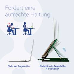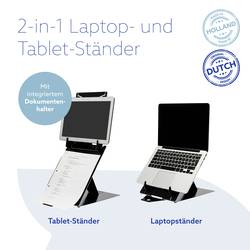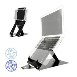 Držák na notebook a tablet Riser-Go Riser Duo pro zvedání vašeho notebooku či tabletu. Stativ lze snadno nastavit v 4 polohách, takže můžete pracovat vždy v úrovni očí. Tímto způsobem se hlava nachází v přirozené poloze a snižuje napětí svalstva na šíji a ramena. Riser Go Riser Duo je mimořádně tenký a lehký: Ideální ideal pro přenášení v kapse!