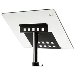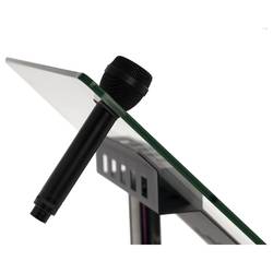 Elegantní: Velká pultová deska a odkládací přihrádka z tvrzeného skla včetně otvoru jako držák mikrofonu.