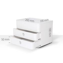 INTELIGENTNÍ BOX Plus, box se 2 zásuvkami a SMART organizérem v prémiové kvalitě. Jedinečný a inovativní design s velmi lesklým provedením pro mnohostranné použití: V kanceláři, na portáních nebo doma. Zásuvky s lehkým chodem s vyjímatelnou příčkou pro dokonalý pořádek. Protiskluzové gumové nožky šetrné k nábytku. Včetně kabelového držáku v rámu země. Libovolně stohovatelný s více allisony nebo organizacemi SMART.