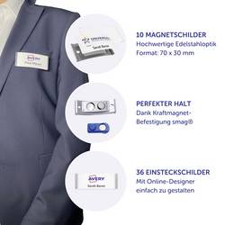 Díky velmi kvalitní kompletní sadě jmenovek je můžete díky vlastnímu popisu 100% flexibilní a nabízí vše, co potřebujete pro okamžité použití nebo spontánní repliky: Jmenovky vč. Upevnění silového magnetu SMAG® a odpovídající jmenovky pro váš individuální popis. Designový jmenovka je díky svému promyšlenému designu dokonalým univerzálním pomocníkem s vysokým komfortem při nošení a brání překlopení štítku. Tento flexibilní model lze kdykoliv přizpůsobit rychle vyměnitelnými jmenovkou, ať už jako denní štítek na oblečení svých zaměstnanců nebo jako jmenovka na veletrzích a akcích.