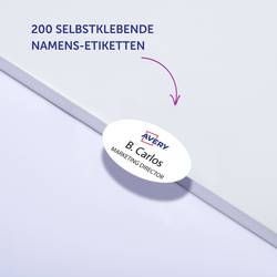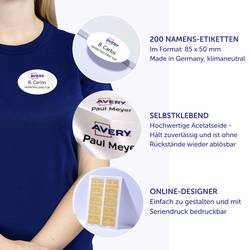 Kvalita štítků od odborníků: Samolepicí, oddělitelné jmenovací štítky L4882-20 pro laserové tiskárny od společnosti Avery Zweckform v oválném formátu 85 x 50 mm vám usnadní organizaci akcí, seminářů, veletrhů a konferencí. 200 bílých, potisknutelných textilních štítků na 20 arších.