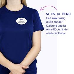 Oválné jmenované štítky jsou perfektní alternativou plastových štítků s jehlou nebo sponou. Jmenovky z acetátové hedvábí spolehlivě drží na oblečení a textilu a lze je beze zbytku opět odstranit. Zadní strana štítku s názvem umožňuje vypalování názvu a nosné fólie pro pozdější použití. Textilní štítky nejsou vhodné pro kůži, hedvábí, samety a další citlivé textilie. Jmenovky nabízí zaručeně vykrojený tisk všech běžných laserových tiskáren. Takto efektivně pracujete bez stresu a vytvoříte tak drahocenný čas pro skutečně důležité věci.