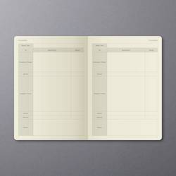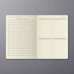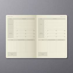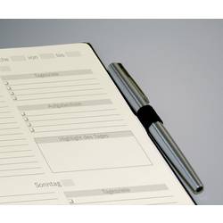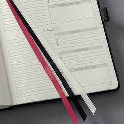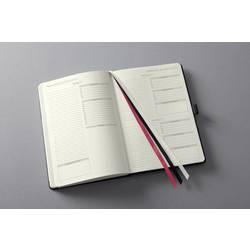 Černý denní plánovač Conceptum, nedatovaný, s německým vnitřním layotem. Tvrdé desky s drážkovaným plastovým povrchem. Obsahuje 400 stran včetně poznámek (částečně perforované pro oddělení sporáků). Papír krémově zbarbý. Nedatované Kalendarium zahrnuje 365 dní. Ukazuje jeden den na jedné straně (SA/so = 1 strana) a lze jej flexibilně a individuálně strukturovat. Kromě přehledného vodního kamene je k dispozici mnoho praktických informací, např. Měsíční přehledy, cílové a reflexní stránky, finanční plánovače, hesla a mnoho dalšího. Mezi další vlastnosti patří putovní poutko, zavírání na gumičku, Quickpocket, archivační kapsa až pro 10 vizitek a 3 kreslicí pásky pro ještě lepší organizaci. S nálepkami k organizování a individualizaci a praktickému bookletu pro individuální plánování úspěchu. Velikost knihy je podobná normě DIN A5. Certifikace PEFC.