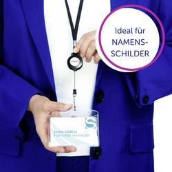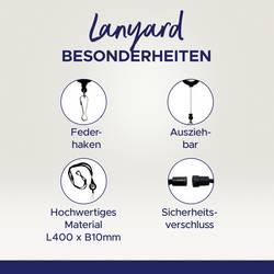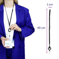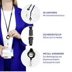 Černé, 15 mm široké Lanyards/závěsné pásky 4830 o délce 440 mm a s praktickou 60 cm výsuvnou mechanikou Jojo od společnosti Avery Zweckform jsou ideální pro konference, semináře a jakékoli profesní nebo soukromé akce. Mechanika Jojo je ideální pro přístupové systémy. Pásky mají bezpečnostní uzávěr a otočnou karabinu pro připevnění průkazů nebo držáků karet. Kromě toho mají závěsné pásky měkké držení pro příjemný pocit při nošení. V nabídce Avery Zweckform jsou k dispozici další Lanyardy v různých barvách a provedeních a také vhodná řešení na jmenovacích značkách. 10 Lanyardů na balení.