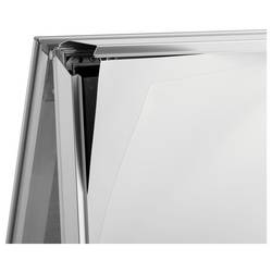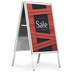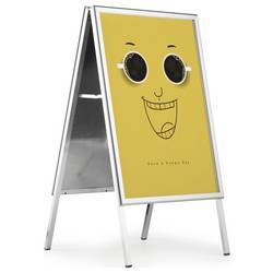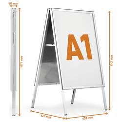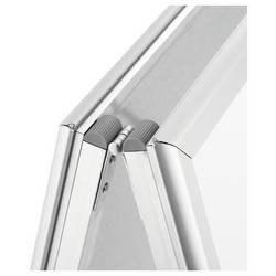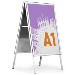 Výklopný oboustranný držák plakátů A1. Odolné proti povětrnostním vlivům díky UV stabilizované poštovní ochranné fólii a gumovému těsnění pro ochranu před vodou. Dvoustranná zákaznická zarážka s hliníkovou skládací technikou, eloxovaná ve stříbrném provedení. Rychlá a snadná výměna motivu díky osvědčené technologii klapek. Rámový profil 32 mm široký. Rohy na pokos. Vnitřní gumové těsnění zabraňuje vniknutí vody (ochrana IPX4 podle DIN EN 60529). PET antireflexová fólie na plakátu stabilizovaná proti UV záření brání prosnutí plakátu sluncem. Zákaznický poutač má pozinkované, nerezová vnější rozměry ve složeném stavu (Š x v x H) 658 mm x 1171 x 81 mm. Hmotnost 4,4 kg.