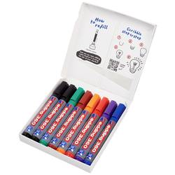 Sada obsahuje 8 popisovačů na bílé tabule - černá 2x, červená, modrá, zelená, oranžová. hnědá a fialová