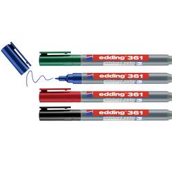 Popisovač na bílé tabule pro jemné psaní a značení na bílé tabule, vhodný také pro flipcharty. Suchý lze z téměř všech uzavřených povrchů, jako např. smaltu a melaminu. Sada obsahuje barvy černá, červená, modrá a zelená. Výrobek lze znovu doplnit o BTK 25 a Edding BT Edding 30. Bez přídavku butyl-acetátu.