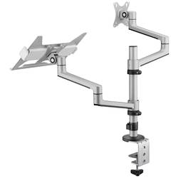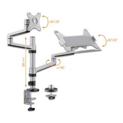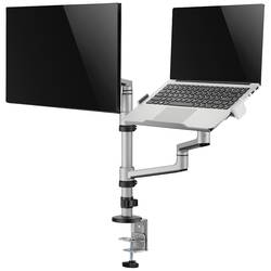 Stolní držák se skládá z kombinace ramene pro monitor a přídavné odkládací plochy pro notebook. Pro všechny, kteří jsou zvyklí pracovat současně na počítači a notebooku, nebo si chtějí odpovídajícím způsobem rozšířit pracovní plochu. Úhel obrazovky lze navíc díky naklápění a otáčení optimálně nastavit. Konstrukce z lehkého kovu nadchne svým štíhlým designem a přitom vypadá i stylem. Díky stabilnímu zpracování udržuje výrobek potřebnou oporu pro vaše zařízení. Váš notebook se upevní pomocí svorekOdkládací plocha je navíc zajištěna. Integrované větrací otvory podporují cirkulaci vzduchu v notebooku.