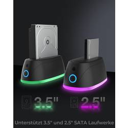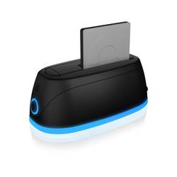 Osvětlení okolí se stává modrým kolem pouzdra. Modrá kruhová LED dioda má nejen optický efekt, ale zobrazuje i provoz a přístup pevného disku. Tato dokovací stanice doplňuje svou kancelář nebo Home Office jako technicky spolehlivý designový objekt.