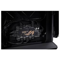 Žádné ROG pouzdro dnes není kompletní bez vestavěného hubu pro ovládání ventilátorů a osvětlení ARGB. Zlatý logo ROG je ozdoben a podporuje až osm ARGB komponent a šest PWM ventilátorů, takže kromě osvětlovacího panelu a čtyř již zabudovaných krytů můžete připojit vlastní osvětlení a chlazení.