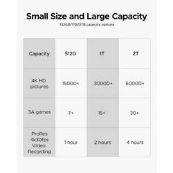 Podporuje záznam a ukládání videa 4K ProRes, k dispozici v možnostech 512 GB, GB, 1 TB a 2 TB, aby byly splněny všechny vaše požadavky na soubory s vysokým rozlišením.