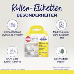 Bílé, trvale přilnavé štítky na role AS0722400 ve formátu 36 x 89 mm od Avery Zweckform jsou vhodné zejména k adresování pneumatik. Každé balení obsahuje 260 nálepky s adresou - ideal pro nízkou spotřebu při občasném použití v kanceláři a doma. Adresní štítky jsou kompatibilní až do 100 % s DYMO LabelWriter™ (LW310, LW330T, LW400 a LW450) a Seiko Smart Label Printer®. Nahraďte si štítky originální Seiko® nebo DYMO® s vysoce kvalitními a cenově atraktivními Avery Zweckform. Tyto termoštítky odpovídají výrobku DYMO® S0722400 (99012) a výrobku Seiko® SCP-2RLE. Avery Zweckform adresovací štítky lze snadno a rychle vytvářet a tisknout pomocí softwaru DYMO® nebo Seiko®. Avery Zweckform je zárukou nejvyšší spokojenosti, jinak dostanete své peníze zpět na 100 % (podmínky účasti v www.avery-zweckform.com/rollenetiketten).